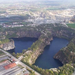 Sur ces images, une vue d'ensemble des carrières Cosyns et Lenoir, de l'emprise du projet sur la carrière Cosyns (montage virtuel), et 3 vues de l'ancienne carrière inondée Notté, qui servirait de parking à ce méga-projet.